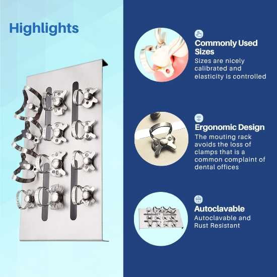 - Rubber Dam Clamps Set of 12 with mounting autoclavable Base sheet.
