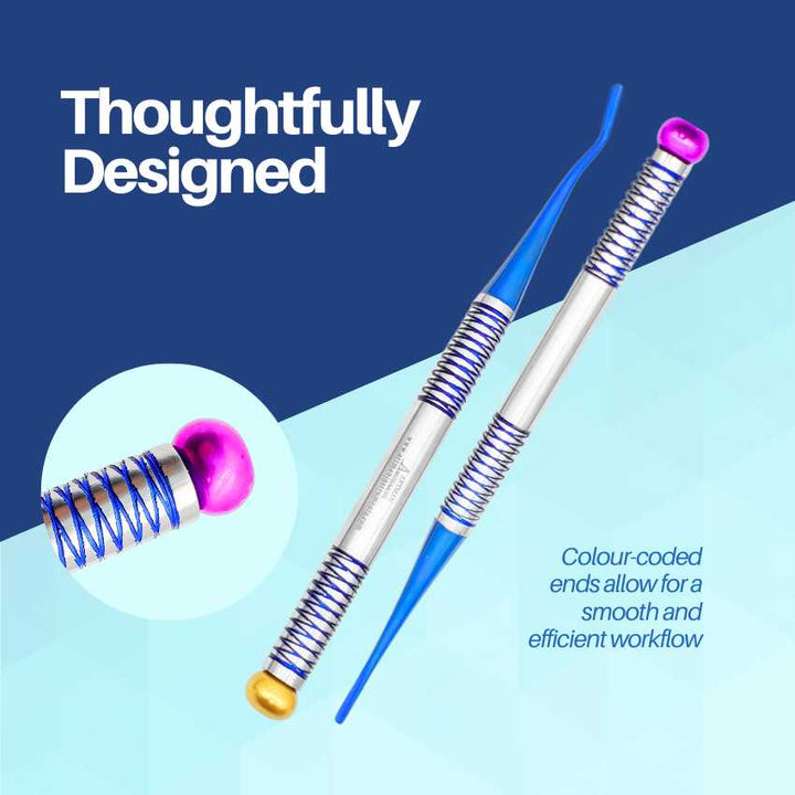 The elevators are color-coded on the back end, making it easy for dental assistants to quickly identify and hand over the correct tool, saving time and improving efficiency during procedures. -